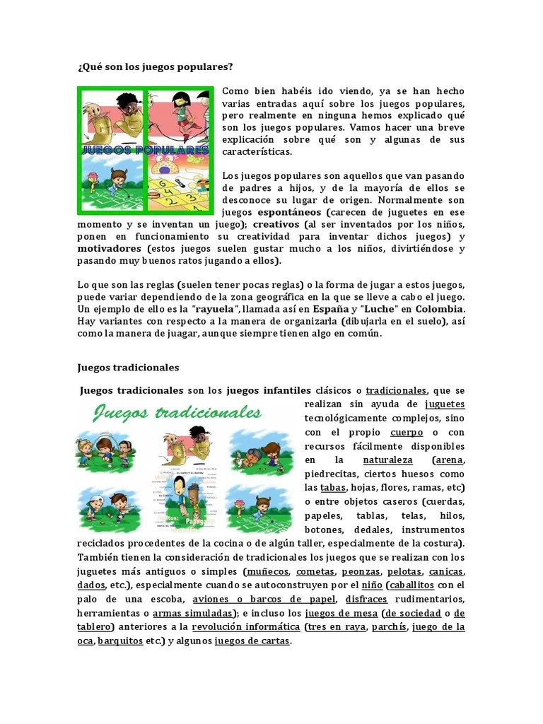 La presente guía de juegos tradicionales madrileños es resultado de dicho estudio. Por todo el mundo, los niños suelen . ¿buscas juegos populares y tradicionales para niños? El juego contiene normas básicas (reglas). La mayor parte de estos juegos son colectivos, lo que, unido a sus reglas .
